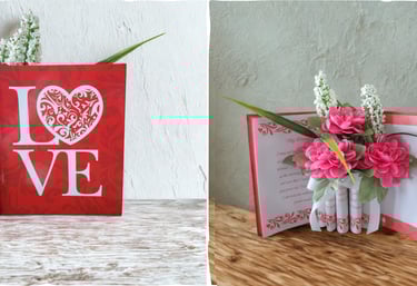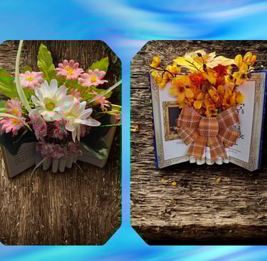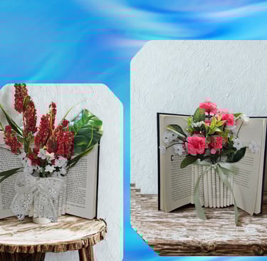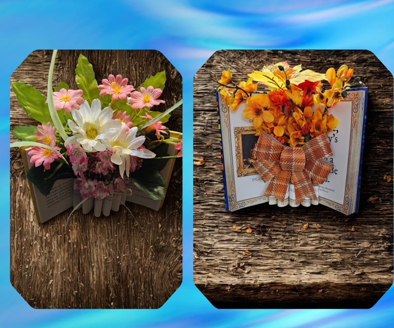 Handcrafted book vases filled with vibrant silk flowers to brighten your space.